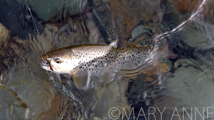 プールのここぞのポイントで、ローズマリーをがっちりくわえたのはブラウントラウトでした。