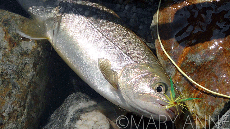 あれ、イワナの腹ビレにメイフライが・・。