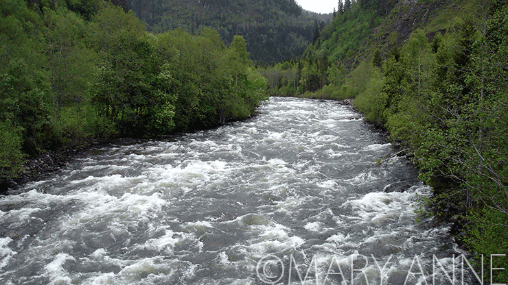 渇水になるとまるで日本の渓流のように澄んで、大きな岩陰からイワナが・・でなく、大きな淵にサーモンが定位しているのが見え、なかなか釣れません。