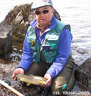 YOSHIさんが大物を釣る方法を教えてくれというので、大きなストリーマーを使うようにと秘策を伝授。30分後、YOSHIさんのロッドが大きく曲がり、いよいよ大物が来たようです。フィアトすること15分。レインボー54cmをゲットです。うれしそうなYOSHIさんと握手。ヤナイさんのおかげ、と言われ、ホッしました。