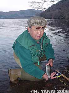 僕は立ち込みが大変な真中のポイントへ。魚は表層にいるらしく、時々ライズが。SWゴールウェイ15’0#8/9/10にDST-11-I(13.1m)、フライはオリジナル・マラブー#10でまずヒット。30分後、またヒットしてヒメマス30cmをゲット。3時まで計3匹。