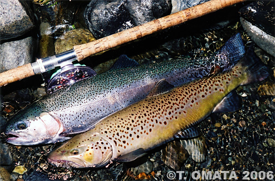 太陽が山に傾いてすぐ釣り始めると、1投目に58cmの精悍なオスのブラウンが釣れた。気をよくしての2投目。顔は小さいが60cmのメスのレインボーが釣れた。幸運の連続ゲット。2匹並べてご機嫌の記念撮影となった。