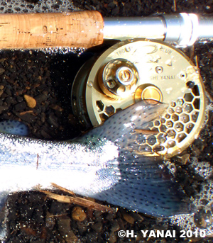 その後、ライズを見つけてすぐキャスト。5投目だったか、ゴロゴロとしたアタリが来た。ゴールウェイが大きく曲がり、かなり強い引きだ。