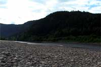 ひたひたになった朝のRenaプール。今日はドピーカンではないが、この澄んだ水では可能性は限りなくゼロ。サーモンもほとんど動かない。