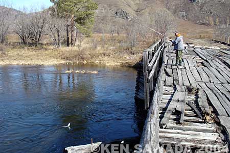 我々はその橋に乗り、壊れて隙間だらけになった板の間から川底を見下ろした。朝日が当たっている橋の直ぐ下流側に、数匹のレノックが見えた。皆50cm近くありそうだった。真下は橋桁のせいで日陰になっており、水中の様子は判らなかった。